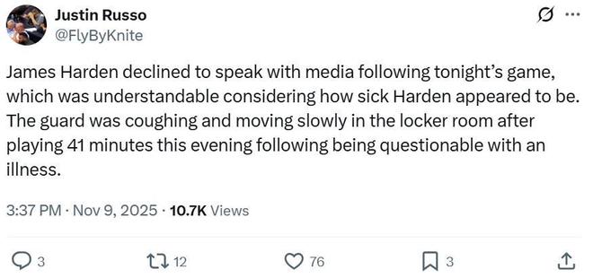 赛后船记Justin Russo表示哈登拒绝了采访,因为后者看起来病得很重,在更衣室里咳嗽不止,行动迟缓,所以完全可以理解。